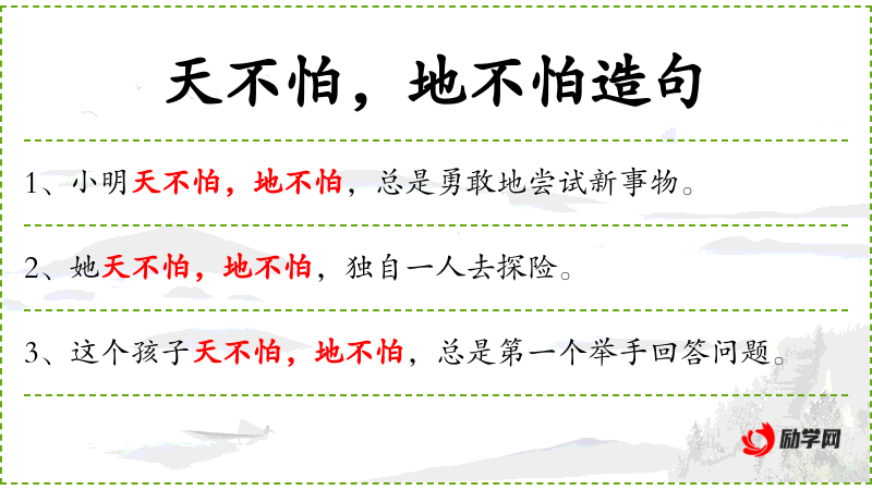 - 天不怕,地不怕:这个成语体现了**文化中对勇敢和无畏精神的推崇。