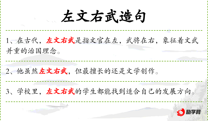 - 左文右武:这个表达可能源自**古代的文化观念,即文武双全,强调全面发展。