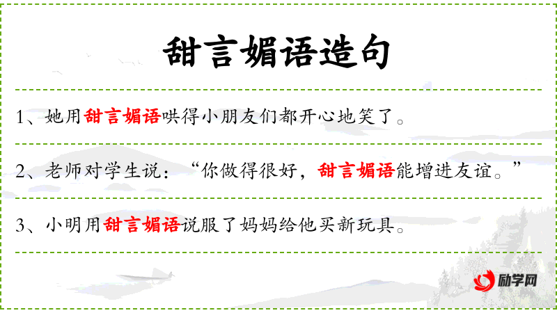 3. 【甜言媚语】 - 甜蜜温柔的话。同“甜言软语”。