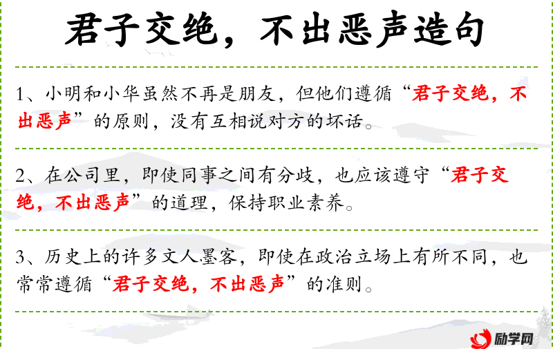 - 君子交绝,不出恶声:成语,意为君子在断交时也不说对方的坏话。