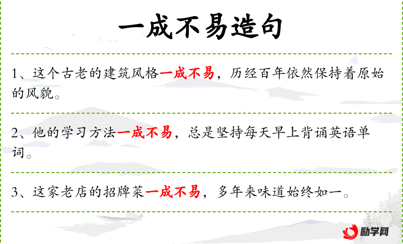 1. 【一成不易】 - 一经形成,不再改变。同“一成不变”。