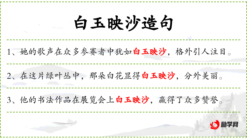 5. 【白玉映沙】 - 像白玉的光映照在沙土上。比喻诗文出类拔萃。