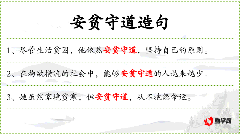 1. 【安贫守道】 安于贫穷,恪守信仰。