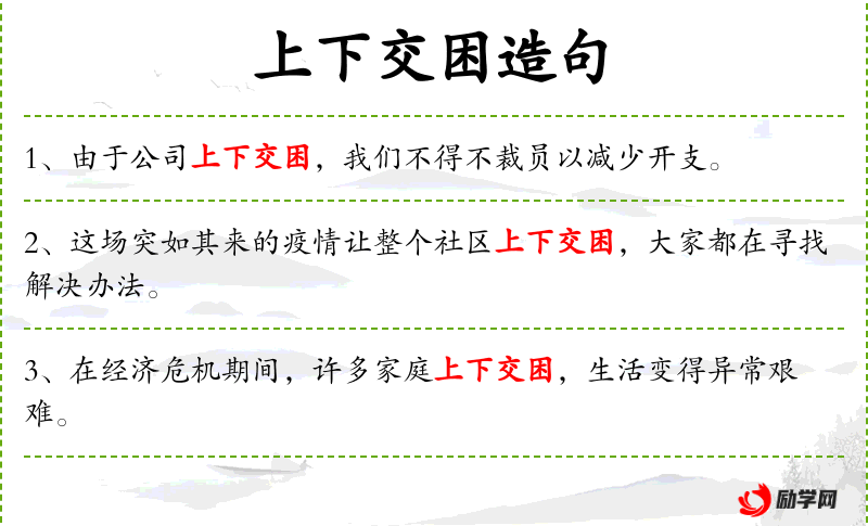 1. 【上下交困】 指国家和百姓都处于困难的境地。