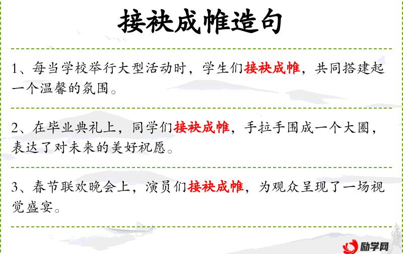 句子:“在毕业典礼上,同学们接袂成帷,手拉手围成一个大圈,表达了对未来的美好祝愿。”