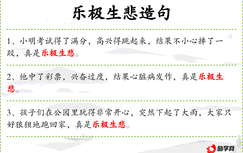 1. 【乐极生悲】 高兴到极点时,发生使人悲伤的事。