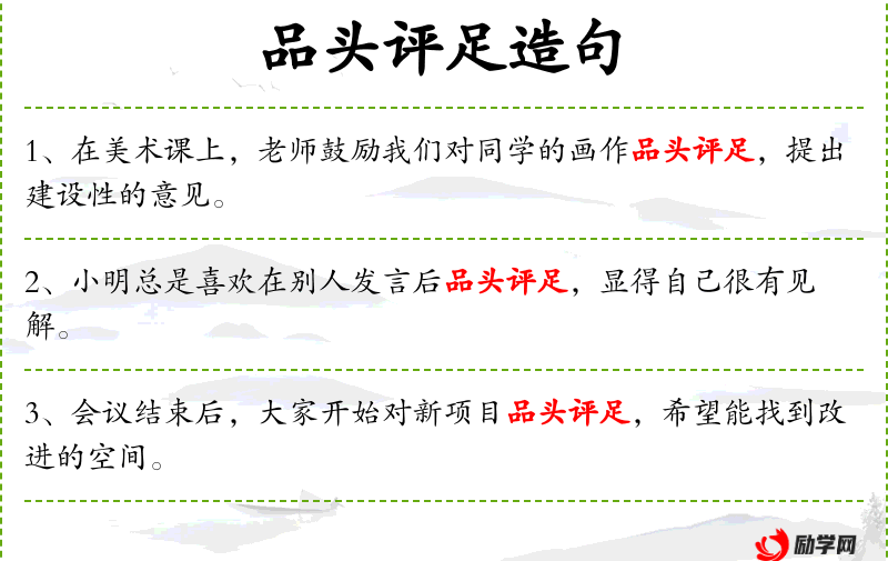 - 相关成语:品头评足 → 指对某人的行为或外表进行评论和评价。