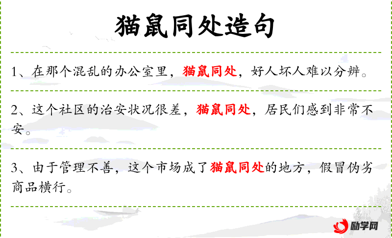 5. 【猫鼠同处】 比喻官吏失职,包庇下属干坏事。也比喻上下狼狈为奸。同“猫鼠同眠”。