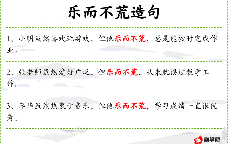 “乐而不荒”是一个成语,强调在享受乐趣的同时不失去节制。这与的教育观念中强调的“学以致用”和“劳逸结合”相契合。