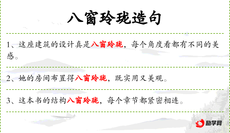 - 定语:“八窗玲珑”(修饰“棋艺”)
