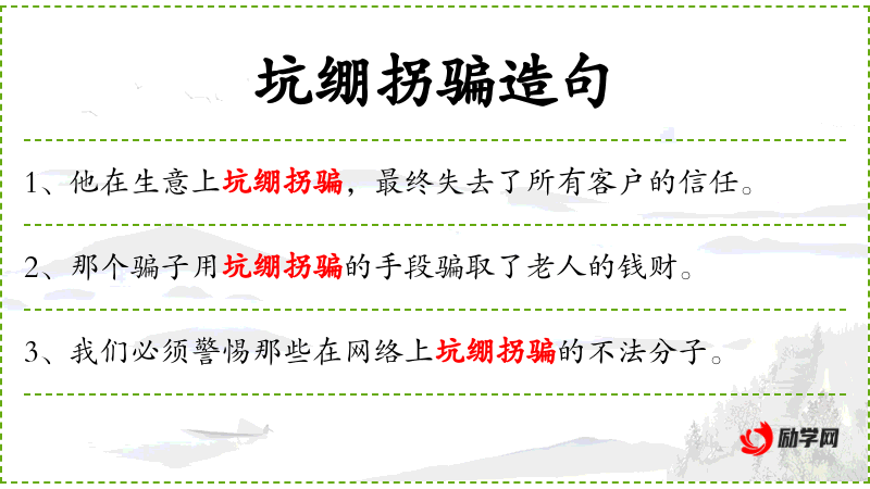 - 坑绷拐骗:形容欺骗手段卑劣、狡猾。