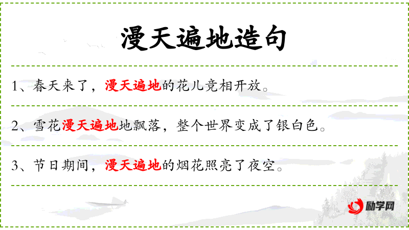 2. 【漫天遍地】 - 满山遍满山遍野,形容数量多、分布广。