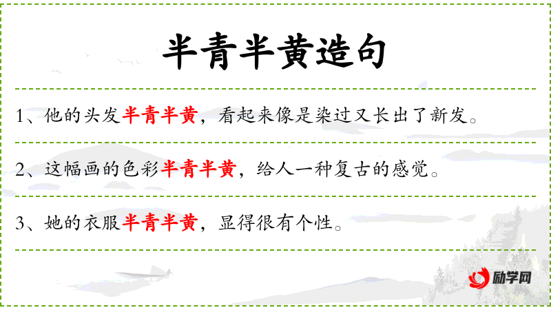 - 半青半黄:表示颜色介于青色和黄色之间,形容叶子颜色的变化。