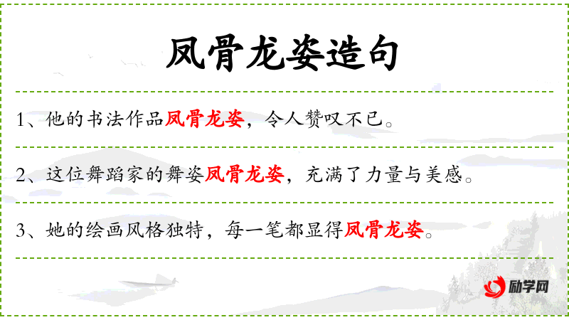 - 凤骨龙姿:形容绘画中的线条或形态优美,如同凤凰的骨骼和龙的姿态。
