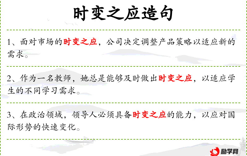 1. 【时变之应】 顺应时势的变化,采取适当的措施。