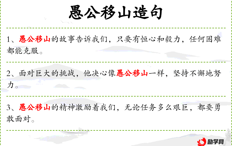 - 愚公移山:**古代寓言故事,比喻坚持不懈、不畏艰难的精神。