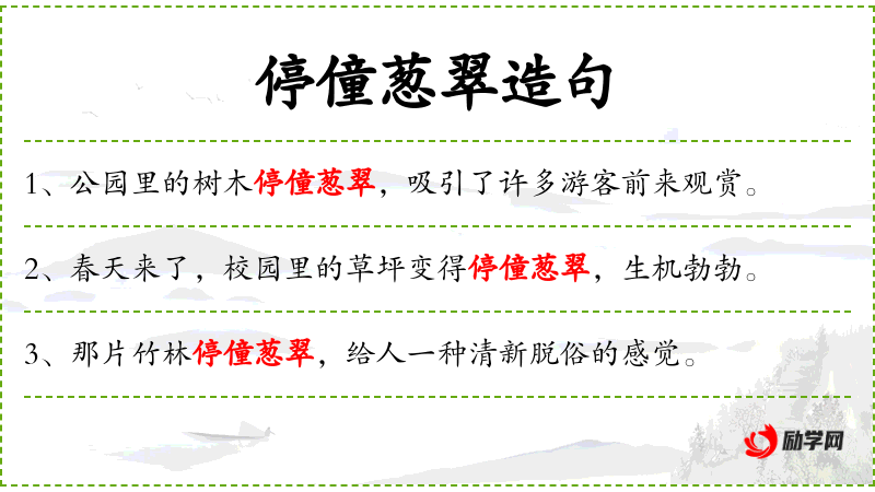 - 停僮葱翠:形容词短语,形容树木茂盛、绿意盎然。