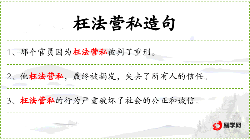 1. 【枉法营私】 - 枉:歪曲,违反。指曲解破坏法律以谋私利。