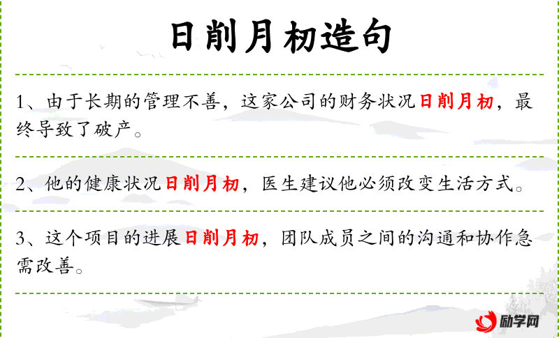 - 相关成语:“日削月劢”是一个典型的汉语成语,用来形容事物逐渐减少或衰退。