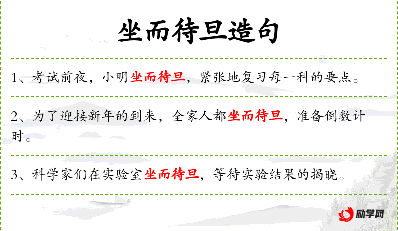 - 坐而待旦:成语,意思是坐着等待天亮,这里比喻家长们在等待孩子放学。