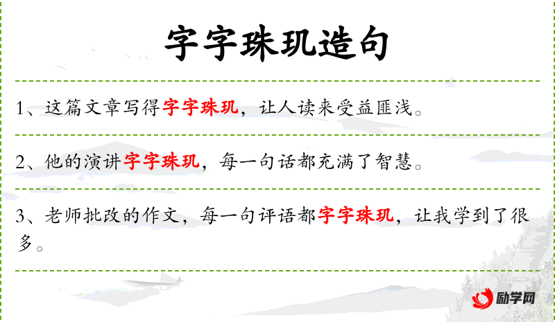 - 字字珠玑:形容言辞非常精炼、珍贵,每个字都像珍珠一样宝贵。
