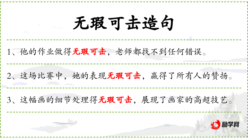 - 无瑕可击:意思是完美无缺,没有任何可以挑剔的地方。
