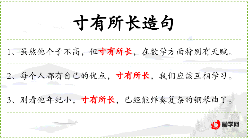 - 寸有所长:这个成语源自《战国策·齐策二》,原文是“尺有所短,寸有所长”,比喻每个人都有自己的长处和短处。