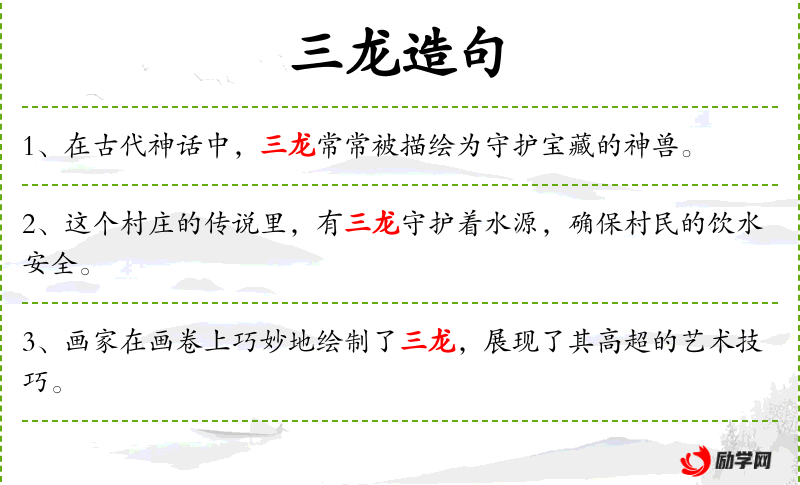 1. 【三龙】 三条龙; 喻三位杰出者。喻汉初三杰张良﹑萧何﹑韩信; 喻三位杰出者。喻汉代蔡邕﹑崔寔﹑许受; 喻三位杰出者。喻宋代孙逢吉﹑孙逢年﹑孙逢辰; 喻三国时魏蜀吴三国。