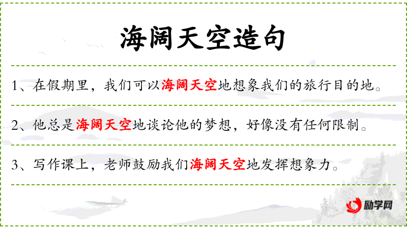 3. 【海阔天空】 - 象大海一样辽阔,象天空一样无边无际。形容大自然的广阔。比喻言谈议论等漫无边际,没有中心。