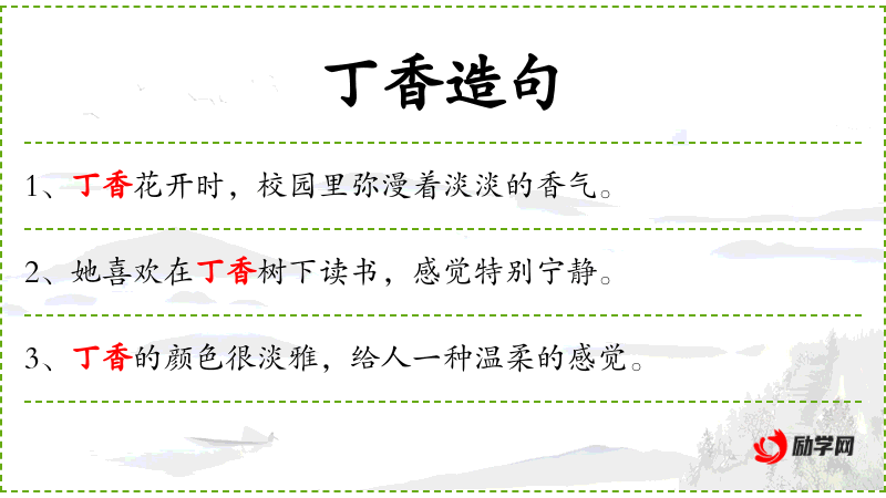 1. 【丁香】 丁香1落叶灌木或小乔木,叶子卵圆形或肾脏形,花紫色或白色,有香味,花冠长筒状。供观赏; 这种植物的花。‖也叫丁香花或紫丁香。 丁香2[dīngxiāng]常绿 乔木,叶子长椭圆形,花淡红色,果实长球形。生在热带地方。花可入药,种子可以榨丁香油,用做芳香剂。