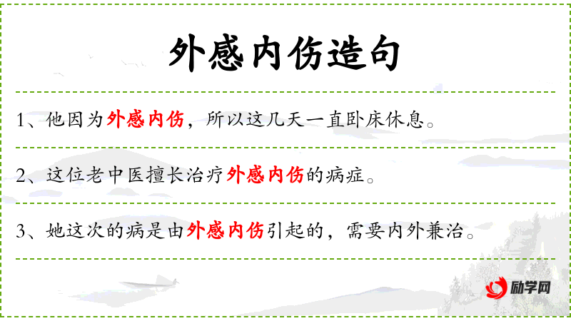- 外感:中医术语,指由外界因素引起的疾病,如风寒、风热等。
