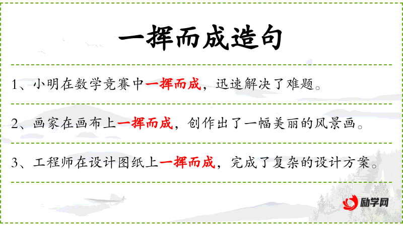 1. 【一挥而成】 - 挥:挥笔;成:成功。一动笔就写成了。形容写字、写文章、画画快。