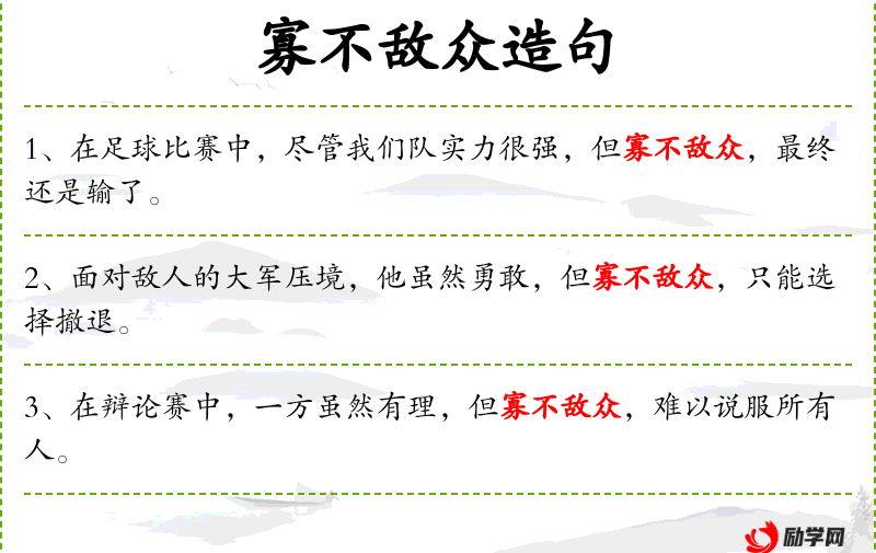 - 寡不敌众:人数少的一方难以对抗人数多的一方。
