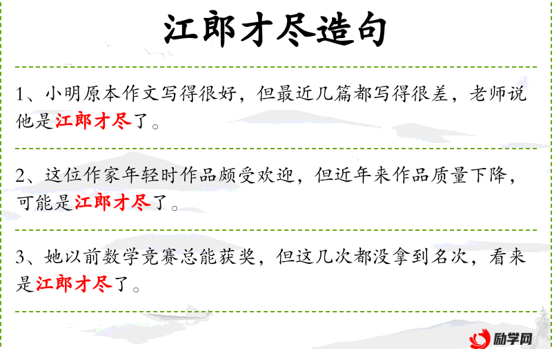 3. 【江郎才尽】 - 江郎:指南朝江淹。原指江淹少有文名,晚年诗文无佳句。比喻才情减退。