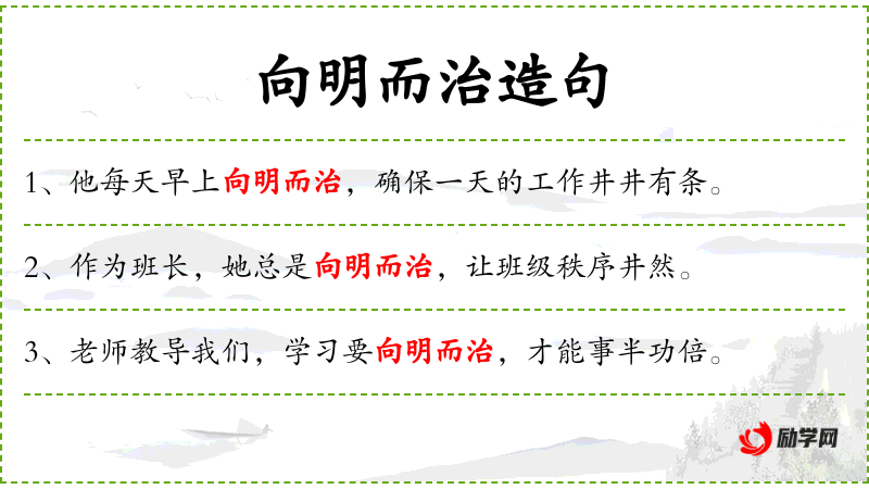 句子:“作为班长,她总是向明而治,让班级秩序井然。”