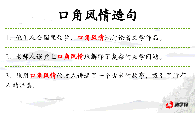 句子中的“口角风情地”可能暗示了一种文化*俗,即在社交场合中以轻松幽默的方式交流思想和见解。这在**文化中可能被视为一种增进人际关系和促进交流的有效方式。
