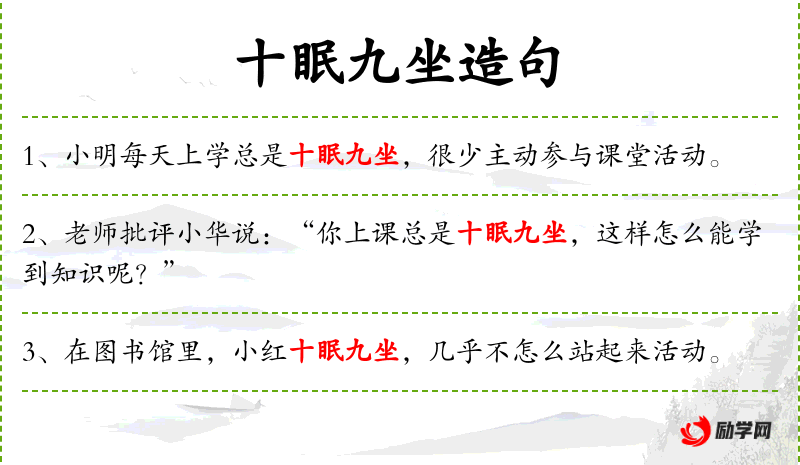 - 宾语:“你做作业时不要十眠九坐,适当站起来活动一下。”