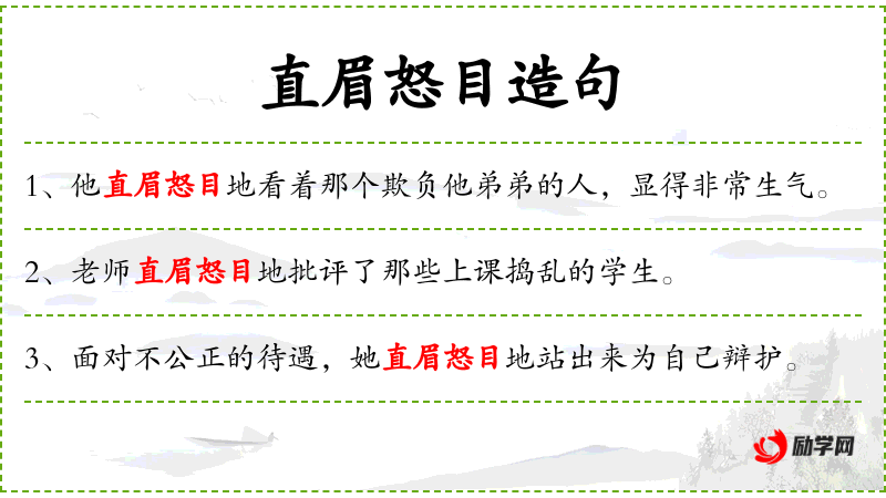 3. 【直眉怒目】 - 形容发怒的样子。
