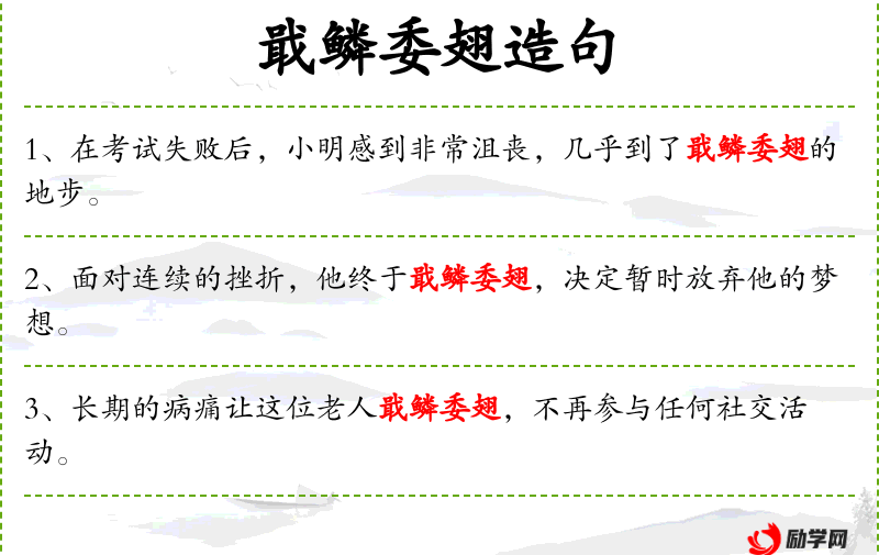 句子描述了小明在考试失败后的情感反应,使用了“戢鳞委翅”这一成语来强调其沮丧的程度。这种表达方式在**文化中常见,用来形容人在遭遇重大挫折后的心理状态。