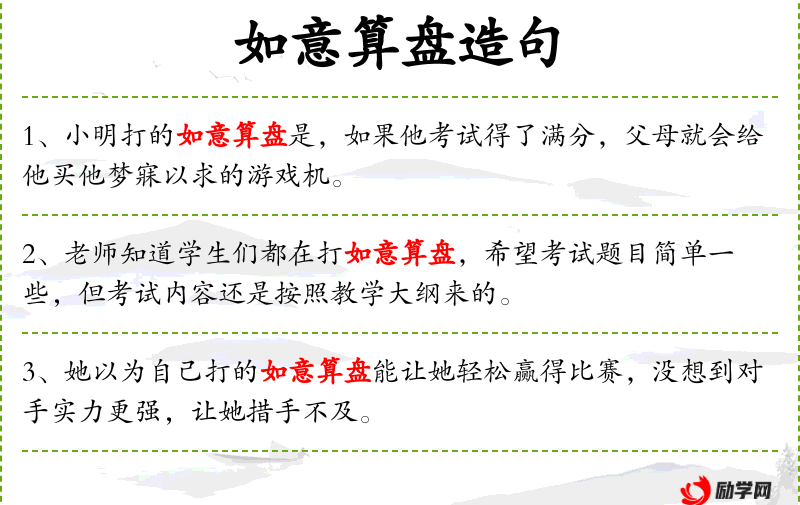 - 相关成语:“打的如意算盘”是一个常用的成语,用来形容某人制定了一个精明的计划。