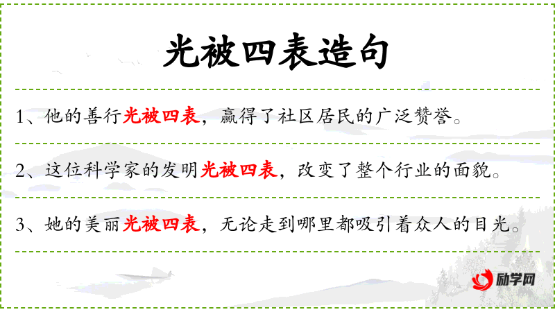 - 光被四表:成语,意为光辉照耀四方,形容事物非常出色,广受赞誉。
