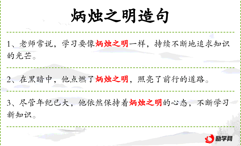 1. 【炳烛之明】 - 点燃蜡烛,用以照明。形容人到老年,好学不倦。