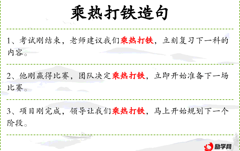 - 乘热打铁:成语,比喻做事要抓住有利时机,及时行动。