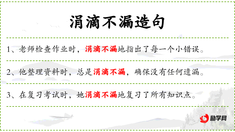 5. 【涓滴不漏】 涓滴:小水珠,比喻极小或极少的东西。一点儿也不遗漏。亦作“涓滴不留”、“涓滴不遗”。
