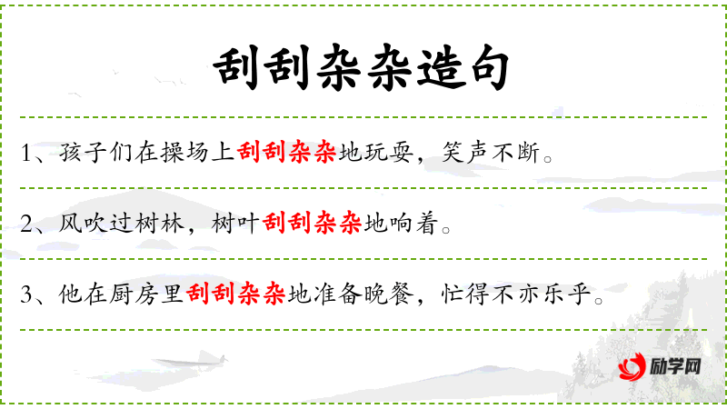 - 刮刮杂杂:形容声音或动作杂乱无章。
