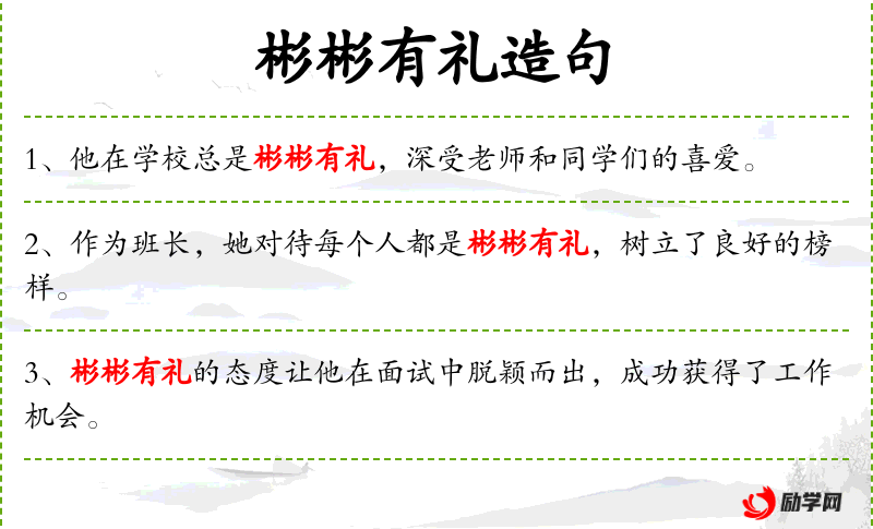 - 彬彬有礼:形容人举止文雅,有礼貌。