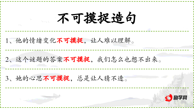 1. 【不可摸捉】 - 摸捉:揣测,预料。指对人或事物无法猜测和估量。