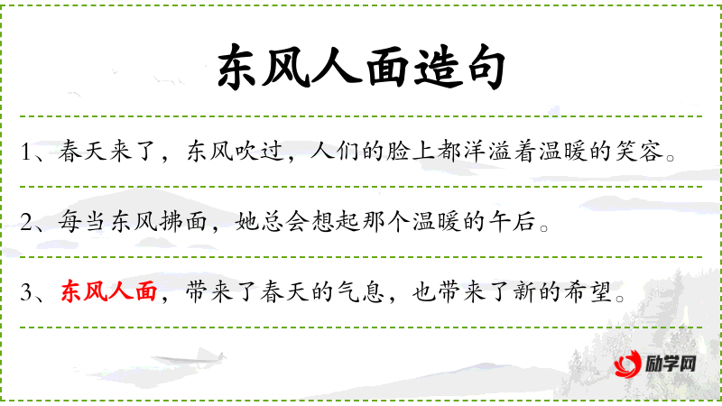 句子:“春天来了,东风吹过,人们的脸上都洋溢着温暖的笑容。”