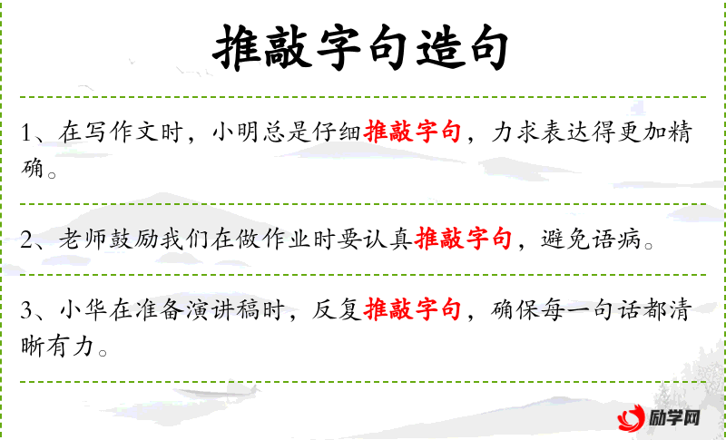 - 推敲:动词,表示仔细琢磨、修改。