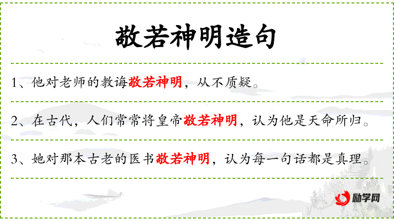 - 敬若神明:表示对某人极度尊敬,如同对待神明一样。